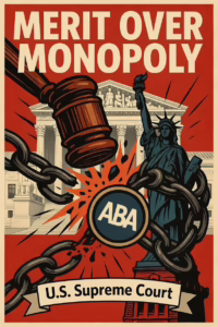 Case Updates ***Thank you to those who share and support this effort to restore our God-given right to earn a living and end discriminatory practices to restore merit-based opportunities to all Americans.*** Case Summary: This case argues that Pennsylvania’s requirement that bar applicants must have graduated from an ABA law school is purposefully discriminatory and unconstitutional. Alex petitioned the U.S. Supreme Court, arguing that the rule violates the God-given fundamental right to earn a living (to work in one’s chosen occupation) and the Due Process and Equal Protection Clauses of the Fourteenth Amendment. The case shows the history of Pennsylvania… Read more: U.S. Supreme Court Petition to Admit All Qualified Applicants to the Bar and Improve Access to Justice - Supreme Court of Texas Grants a Win for the Merit Over Monopoly Fight to Access the State’s Bar